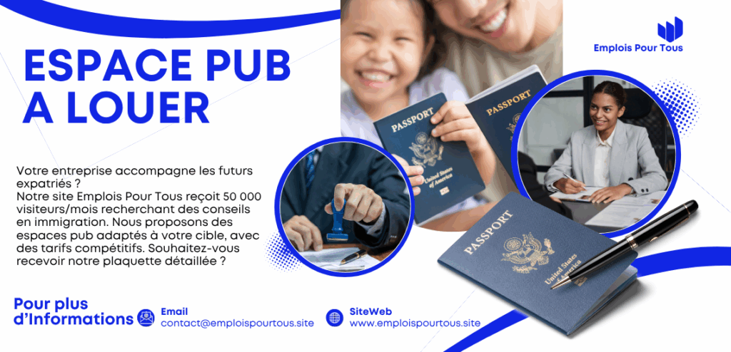 Votre entreprise accompagne les futurs expatriés ? Notre site Emplois Pour Tous reçoit 50 000 visiteurs/mois recherchant des conseils en immigration. Nous proposons des espaces pub adaptés à votre cible, avec des tarifs compétitifs. Souhaitez-vous recevoir notre plaquette détaillée